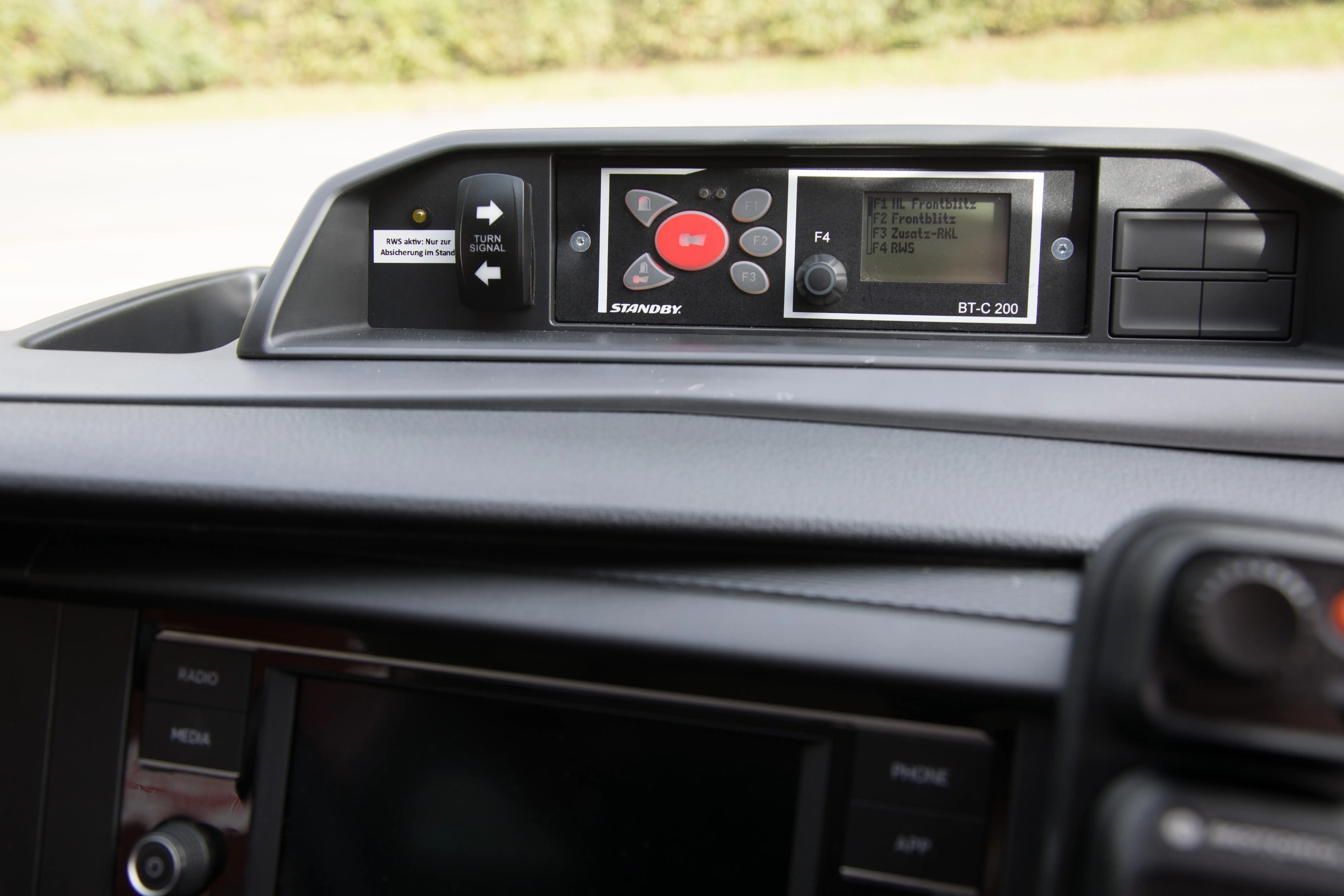 Die Sondersignalanlage besteht aus einem Blaulichtbalken mit integrierten Arbeitsscheinwerfern zur Umfeldbeleuchtung nach vorne und zu den Seiten sowie eingebauten Druckkammerlautsprechern, die auch als Außensprechanlage in Sonderlagen eingesetzt werden können. Zusätzlich sind Frontblitzer und ein Heckblaulicht verbaut. Zur Verkehrsabsicherung gibt es eine Heckwarneinrichtung, die bei geöffneter Heckklappe durch interne Heckblitzer in der Kofferraumklappe ergänzt wird.