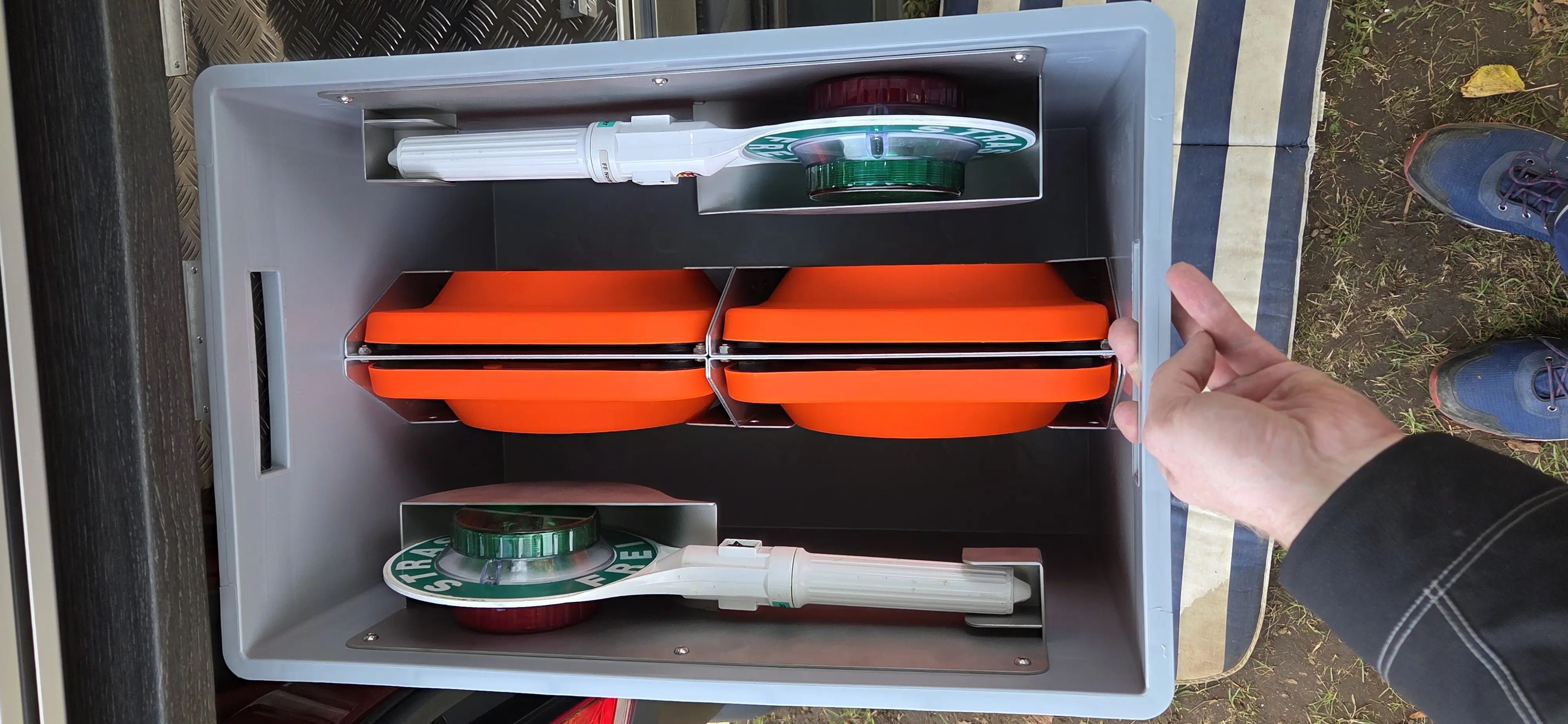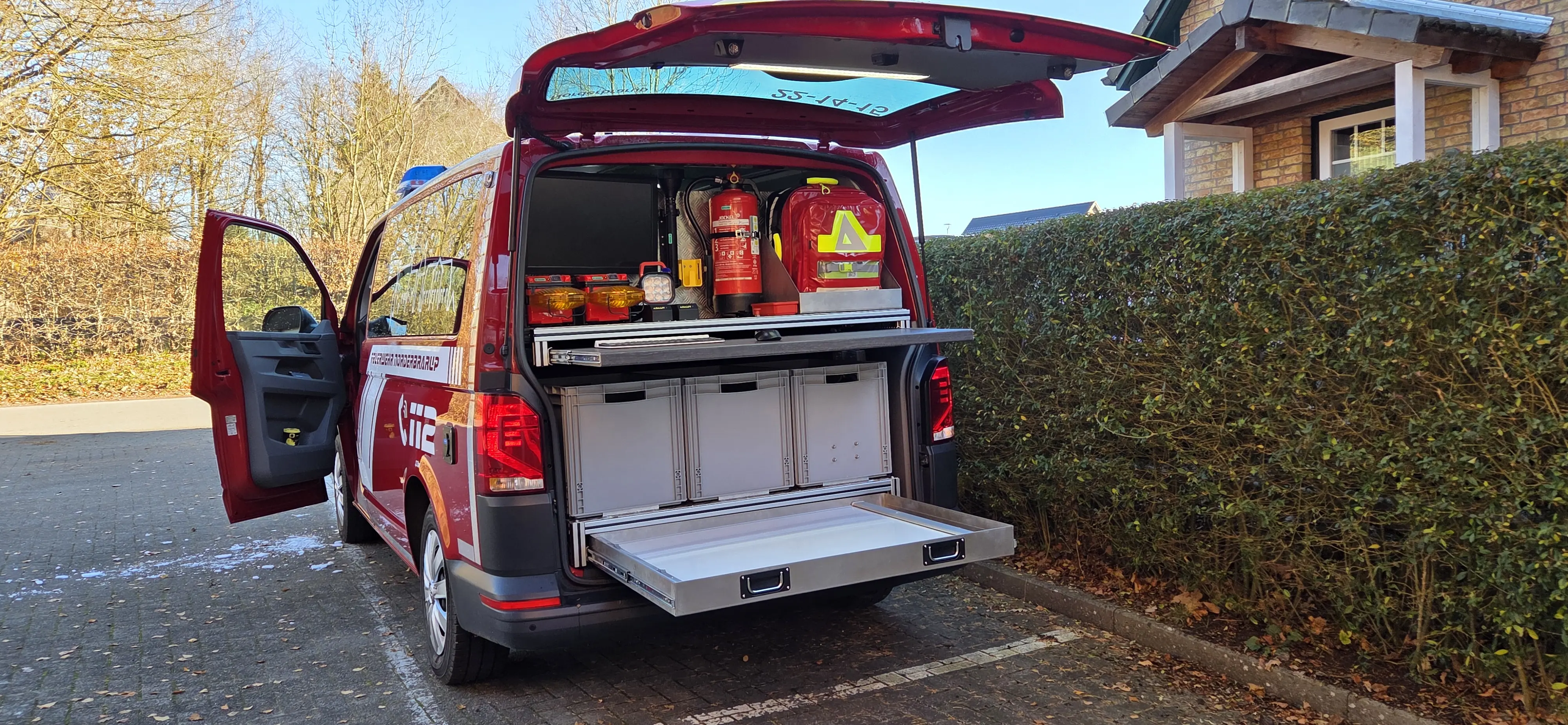 Im Heck befindet sich ein modulares Regalsystem, das im unteren Teil ein Schubfach für ein Flipchart hat, das als Magnettafel für die taktischen Zeichen in der Lagekartenführung dient. Darüber ist ein Fach mit 3 großen Mehrzweck-Euroboxen, die frei befüllt oder mit vorgepackten Zweckkisten (z.B. Verkehrsabsicherung, Transport von kontaminierter Schutzkleidung etc.) bestückt werden können. Ohne Boxen kann eine Freifläche genutzt werden. In der oberen Ebene befindet sich ein Rettungsrucksack mit Defibrillator, ein Feuerlöscher, diverse Ladegeräte sowie ein PC für die Einsatzleitung, der über Tastatur und Maus auf einer ausziehbaren Arbeitsplatte bedient werden kann.