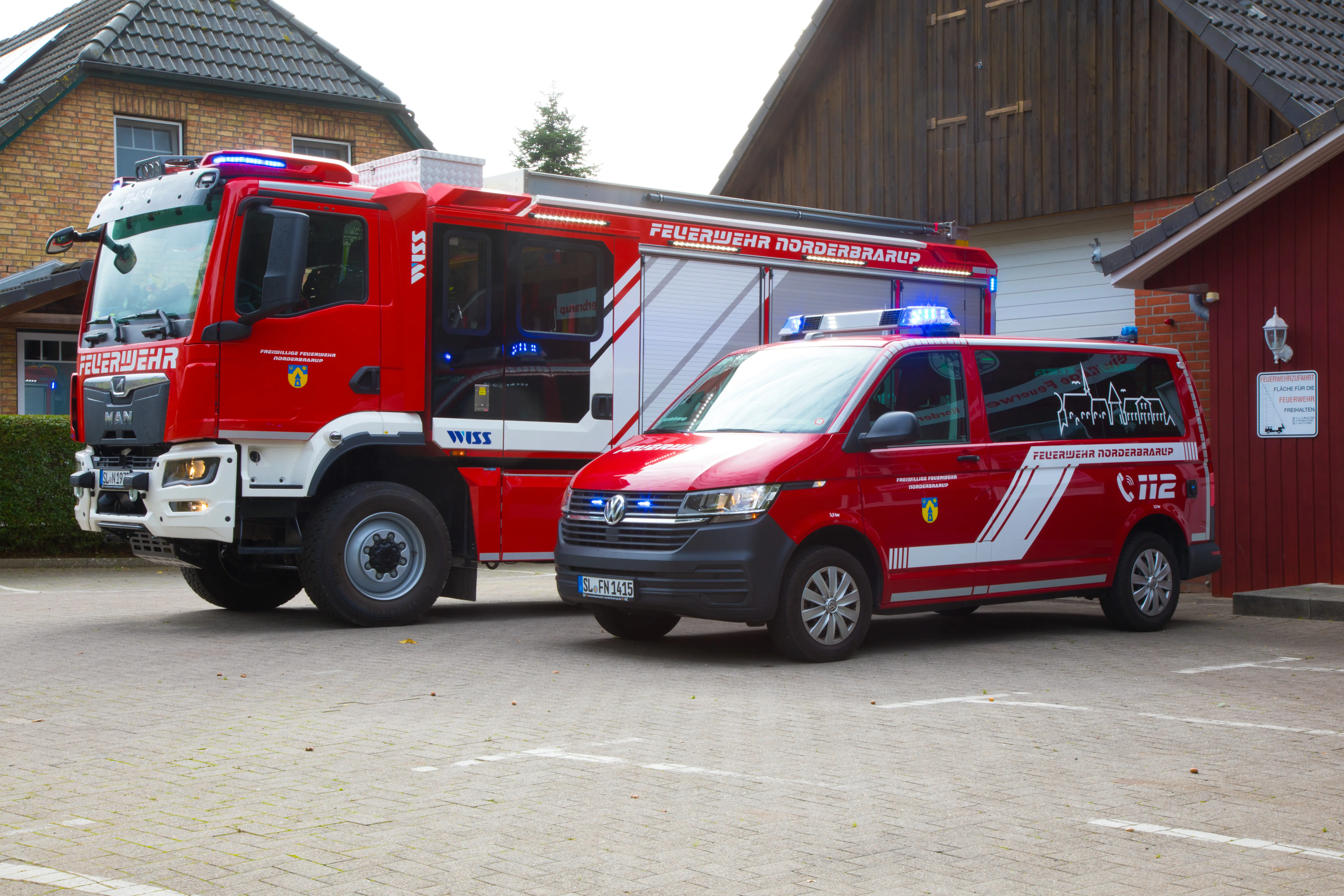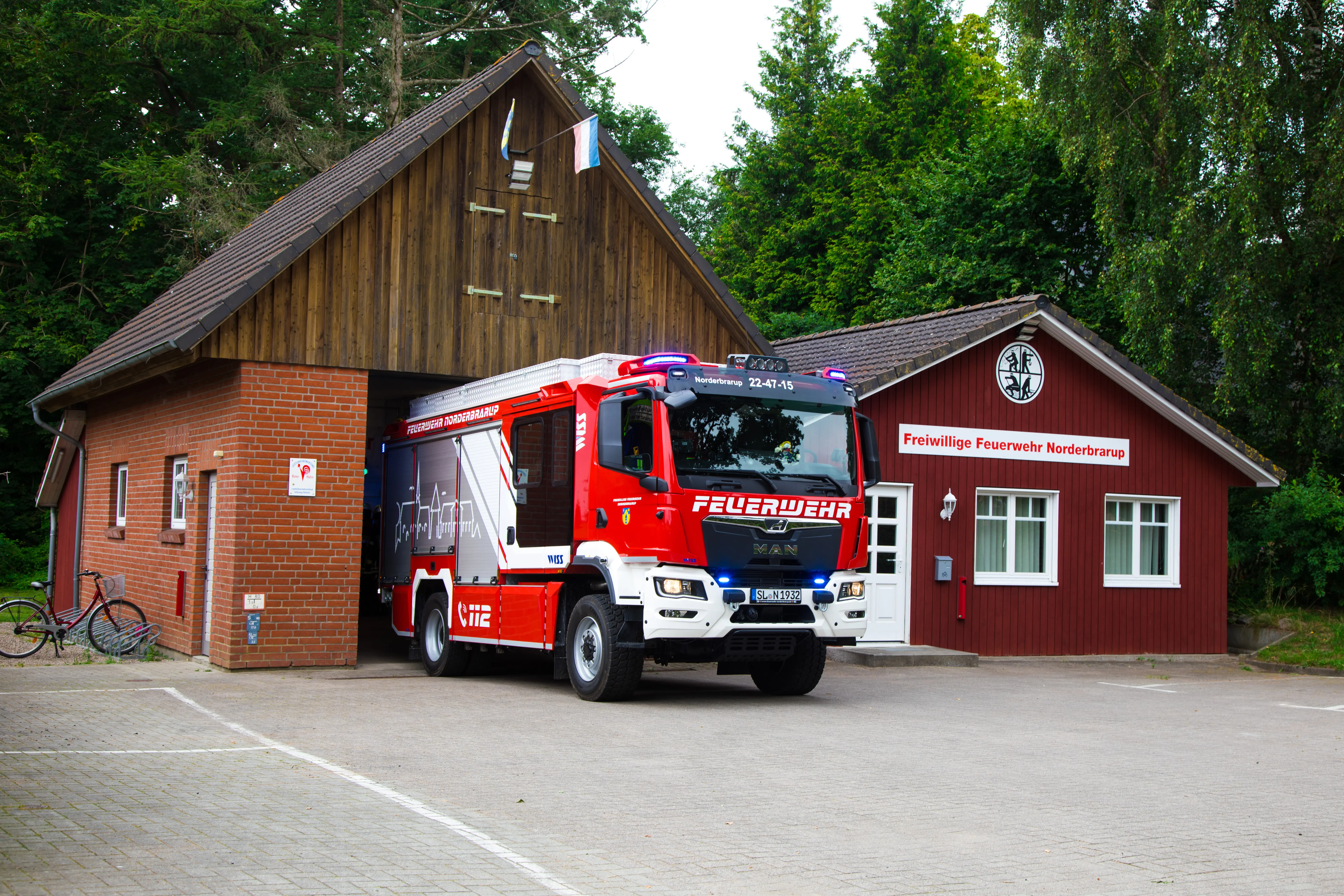 Das TSF-W kam stark in die Jahre und näherte sich der Altersgrenze von 25 Jahren, sodass die Gemeindevertretung im Februar 2020 den Beschluss fasste, es Rahmen der Sammelbeschaffung „SH 1“ durch ein neues Fahrzeug (LF 10) zu ersetzen. Zu dem Zeitpunkt ahnte noch niemand, dass durch Lieferschwierigkeiten aufgrund der Corona-Pandemie und des Krieges in der Ukraine mehr als vier Jahre Wartezeit entstehen würden und dass sich auch in der Feuerwehr Norderbrarup eine eigene kleine Krise ereignen sollte: Bei der Jahrhundertsturmflut war die Wehr am 20.10.2023 in Arnis zum Sandsäckefüllen eingesetzt, als ein Teleskoplader rückwärts in das stehende Norderbraruper TSF-W rammte und dabei den Fahrzeugaufbau zerriss. Es entstand ein wirtschaftlicher Totalschaden. Da die Lieferung des neuen LF10 zu dem Zeitpunkt erst in 14 Monaten erwartet wurde, musste eine Zwischenlösung her. Dazu konnte ein gebrauchtes LF 10/6 zunächst geliehen und dann erworben werden, mit dem die Zeit bis zur Lieferung des neuen LF 10 überbrückt werden konnte. Am 13. Juli 2024 erfolgte dann die feierliche Schlüsselübergabe des nagelneuen LF 10 durch Bürgermeister Peter Clausen die versammelten Kameradinnen und Kameraden, bei der ca. 200 junge und alte Gäste aus dem Dorf, aus Nachbargemeinden und anderen Feuerwehren am Gerätehaus die Chance wahrnahmen, das neue Auto zu erkunden und die ein oder andere Runde durchs Dorf zu drehen. „Wir sind sehr glücklich, dieses Fahrzeug nach so langer Wartezeit endlich in Empfang nehmen zu dürfen, denn es stellt nicht nur eine Ersatzbeschaffung dar, sondern bietet einen erheblichen Mehrwert und eine Verbesserung der Sicherheit im Ausrückbezirk, von der wir alle profitieren“, so Wehrführer Stephan Kock bei seiner Ansprache.